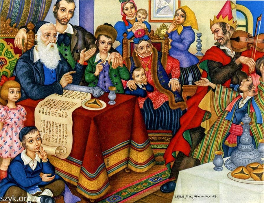 En 1948, il réalise une série d’images consacrées aux fêtes juives, dont Pourim. Cette scène montre une célébration traditionnelle : la lecture de la Méguila se déroule dans une maison, où des personnages costumés partagent un moment de joie. Par ses couleurs vives et ses compositions animées, Szyk transmet l’atmosphère chaleureuse et festive de cette fête.