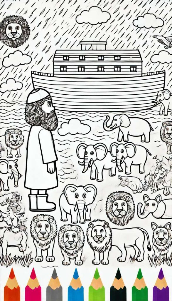 Le déluge commence, Noé, sa famille et les animaux montent dans l’arche. Il pleut quarante jours et quarante nuits. Après 150 jours, l’eau baisse, l’arche repose sur le mont Ararat. Noé envoie un corbeau puis une colombe pour voir si la terre est sèche.