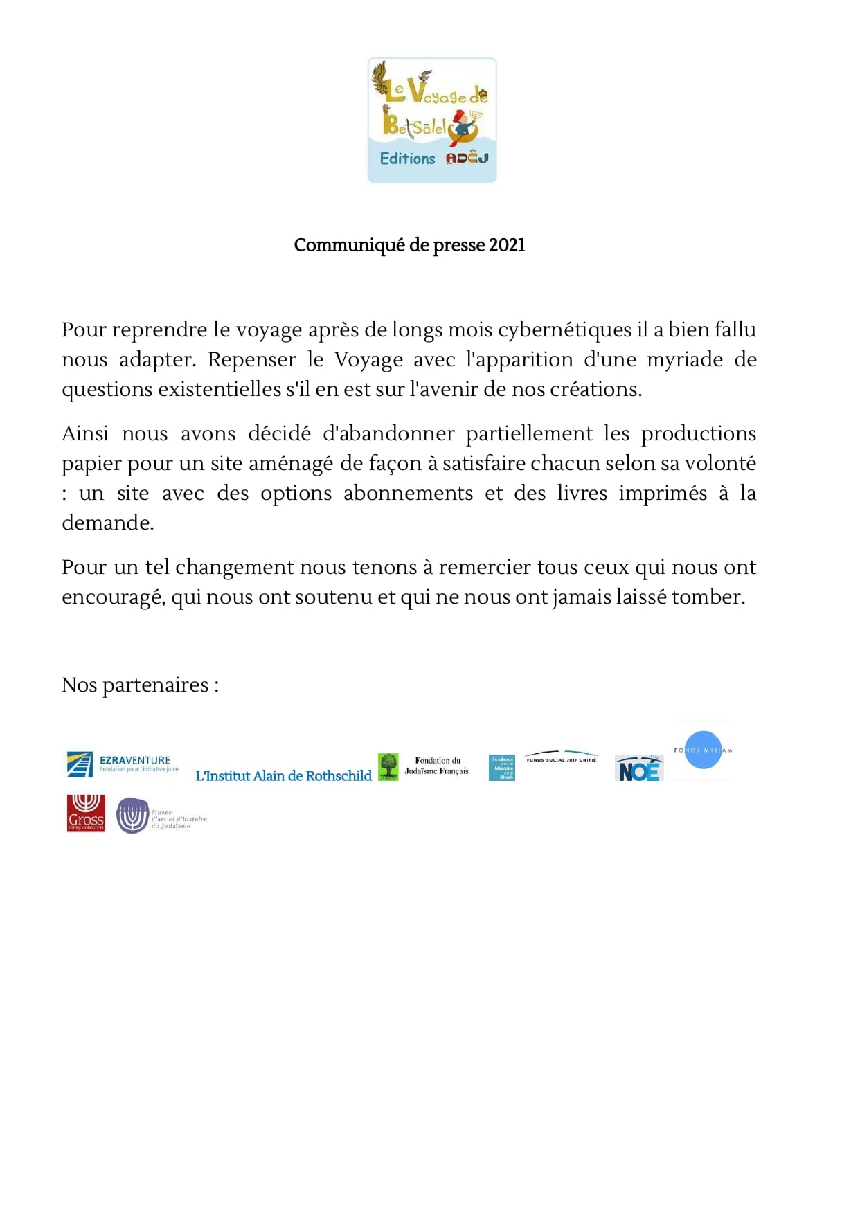 Tous les éléments du site www.levoyagedebetsalel.com sont protégés par le droit d’auteur. A ce titre, toute reproduction, représentation, utilisation, adaptation, modification, incorporation, traduction, commercialisation, partielle ou intégrale des éléments contenus dans ce site, sans l’autorisation écrite préalable des auteurs ET de l’ADCJ, est interdite.